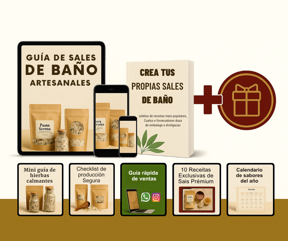 🌿 Con esta guía, tendrás todo lo necesario para comenzar a crear y vender tus propias sales de baño artesanales… Pero eso es solo el inicio. Mira todo lo que también recibirás: